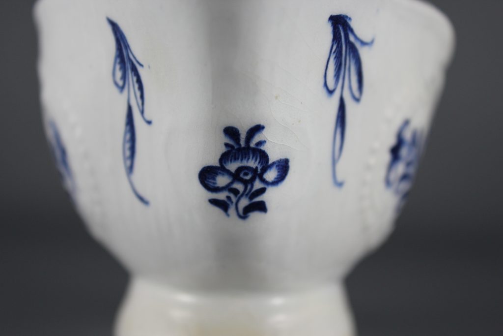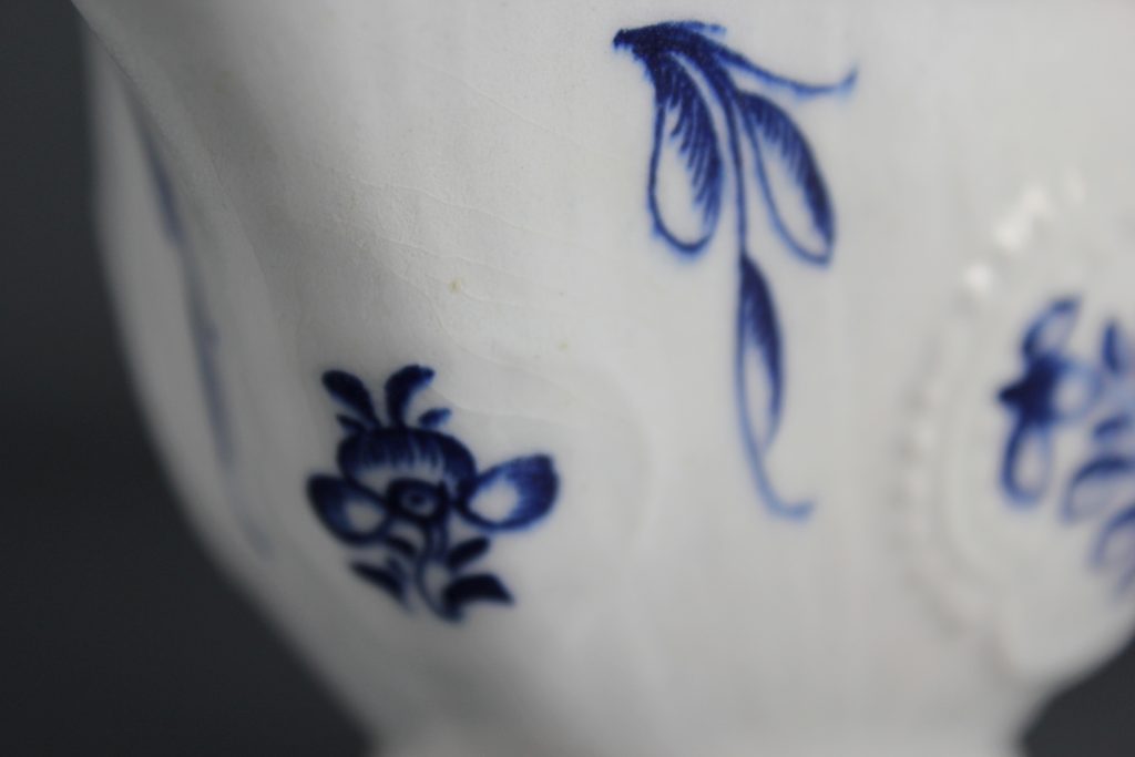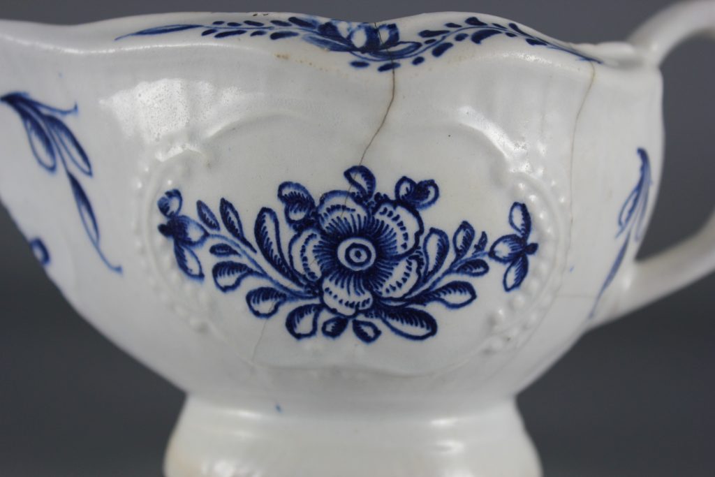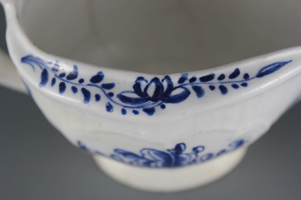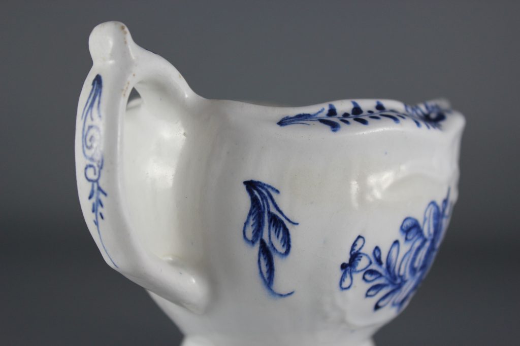 This pleat-moulded pedestal sauceboat is decorated with two large relief-moulded cartouches containing leafy flower sprays, painted in underglaze blue. A small cartouche beneath the pouring lip contains a single flower. The remainder of the exterior is painted with scattered leaves. The interior base is painted with a large tulip. The pouring lip is painted with a flower. The inverted rim is painted in underglaze blue with a trailing floral design and the handle is painted with scroll motifs.