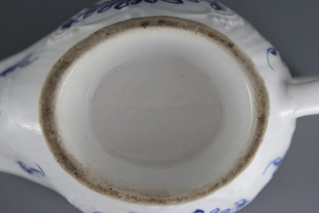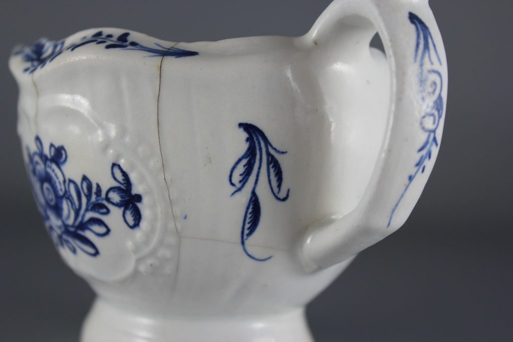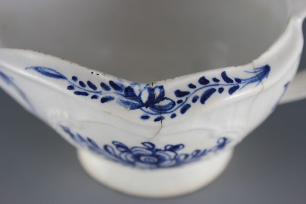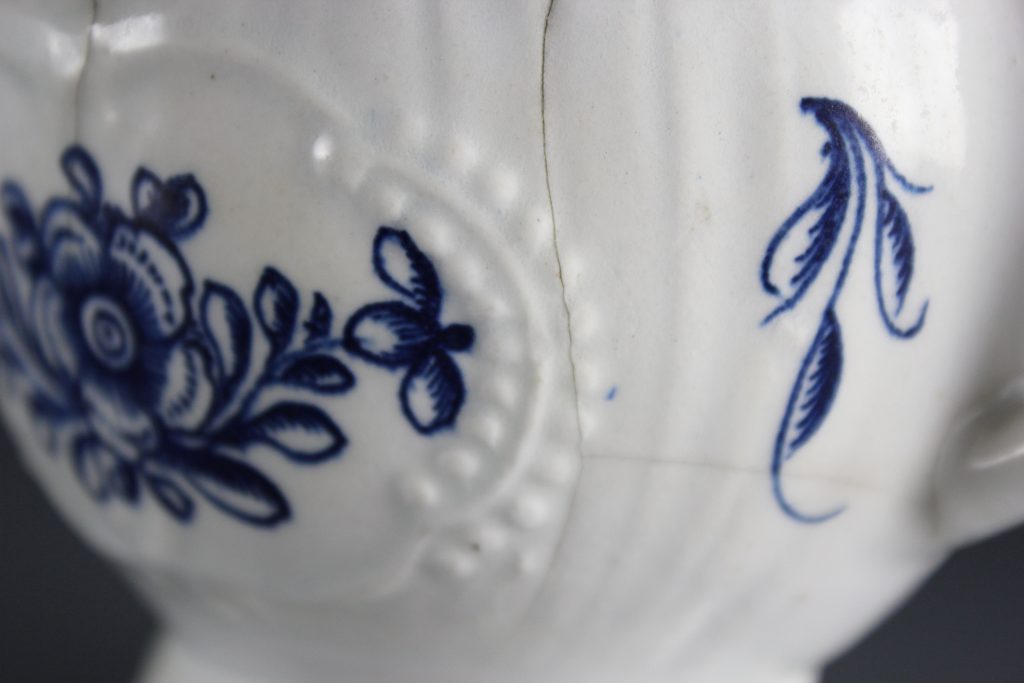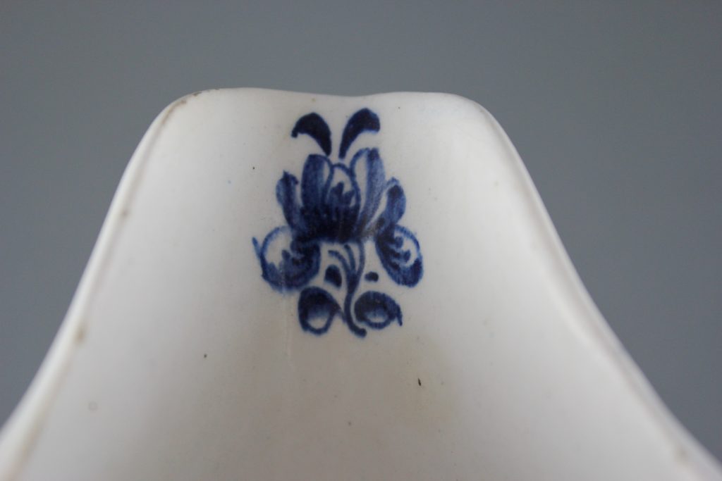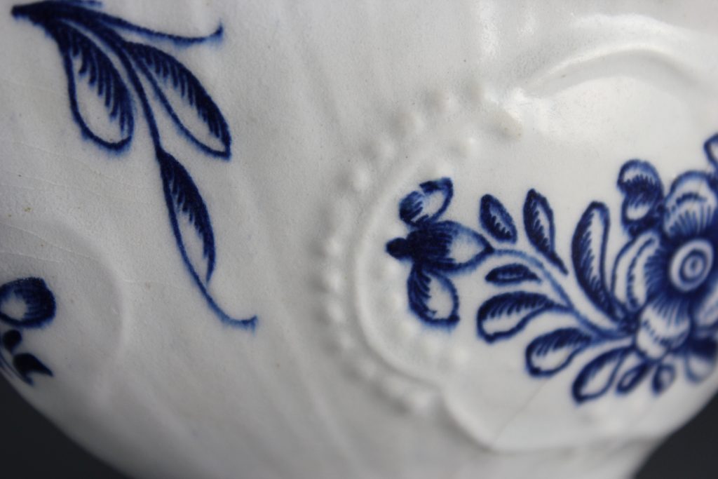 This pleat-moulded pedestal sauceboat is decorated with two large relief-moulded cartouches containing leafy flower sprays, painted in underglaze blue. A small cartouche beneath the pouring lip contains a single flower. The remainder of the exterior is painted with scattered leaves. The interior base is painted with a large tulip. The pouring lip is painted with a flower. The inverted rim is painted in underglaze blue with a trailing floral design and the handle is painted with scroll motifs.
