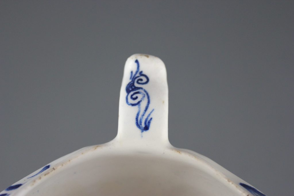 Although not unique to Isleworth, the shape of this sauceboat, with its inverted rim, handle type, and pedestal foot is certainly known to have been made there. The deep pedestal base is of special interest as it seems to have only been used at Isleworth. The use of parallel shading on the leaves and flowers has particularly close similarities to Isleworth painting. It also exhibits characteristics typical of Isleworth porcelain, including horizontal crazing, bubbles in the glaze, and virtually no translucency. The identity of the maker is presently unknown, but combined with the science, Isleworth would appear to be the strongest candidate at present.