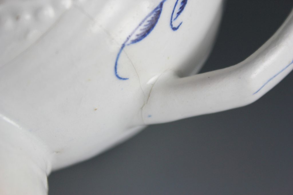 Condition: There are two Y-shaped cracks to one side of the body, extending from the rim, and also a faint crack around the lower handle terminal, and some light staining. There are one or two patches of light chipping and glaze wear to the rim, foot rim and handle, and characteristic crazing to the glaze overall. No other damage and no restoration. From manufacture, there are pinholes and tiny pieces of grit to the body, along with one or two small patches around the raised foot, where the glaze has crawled or withdrawn slightly.