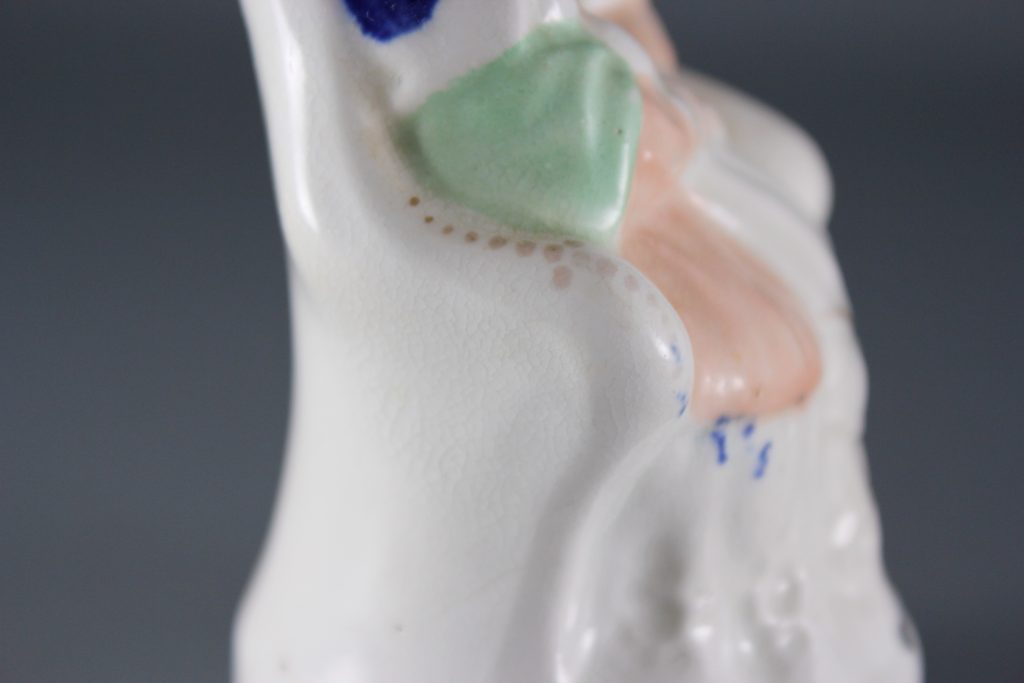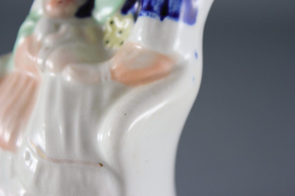 Condition: No damage or restoration. The figure is well-coloured and both of their faces are attractively painted. There is typical light wear to some of the gilt details, and a tiny flake to the black enamel at the back of Victoria’s head. There is some typical light crazing to the clear glaze. Minor anomalies from manufacture include a patch of kiln dust to the rear of the base, and also some transfer of the underglaze blue decoration. No restoration or overpainting.