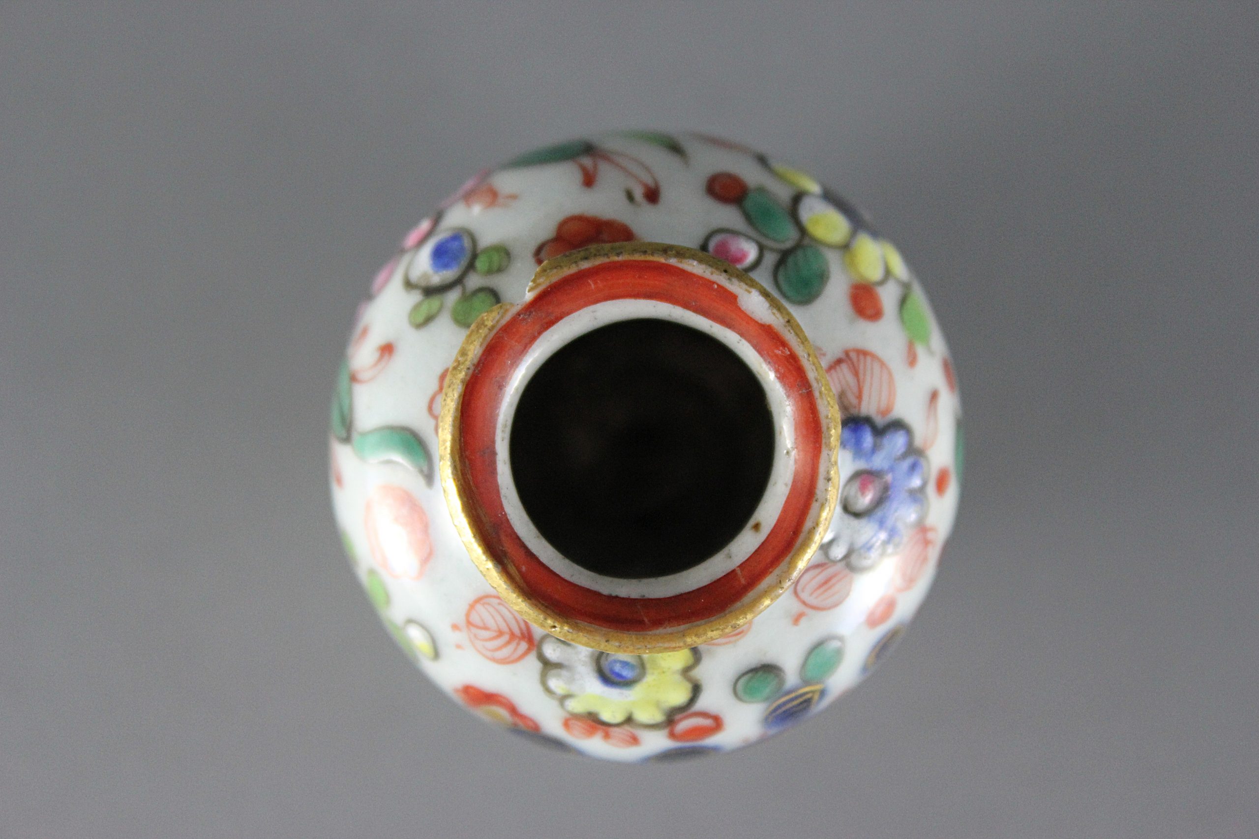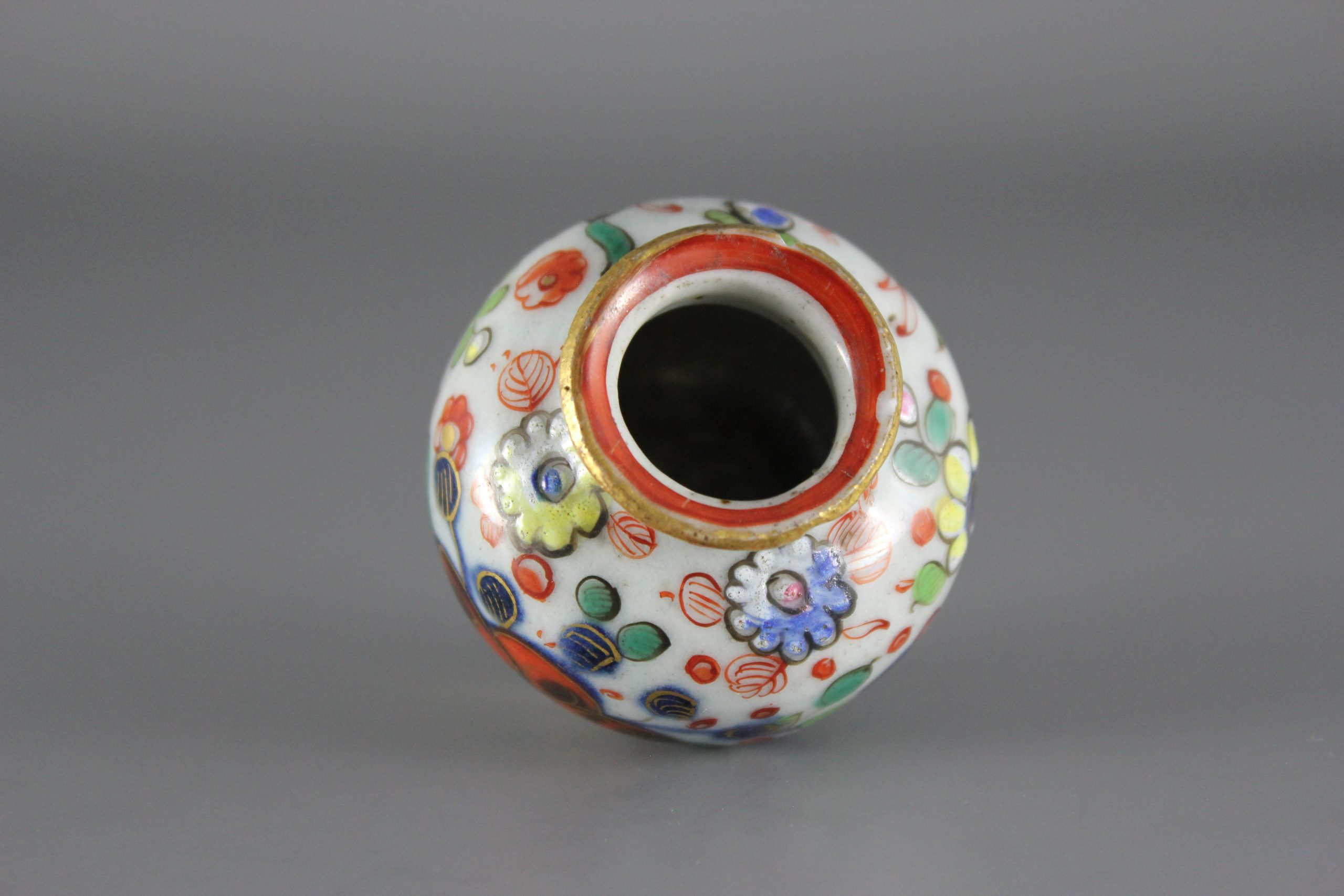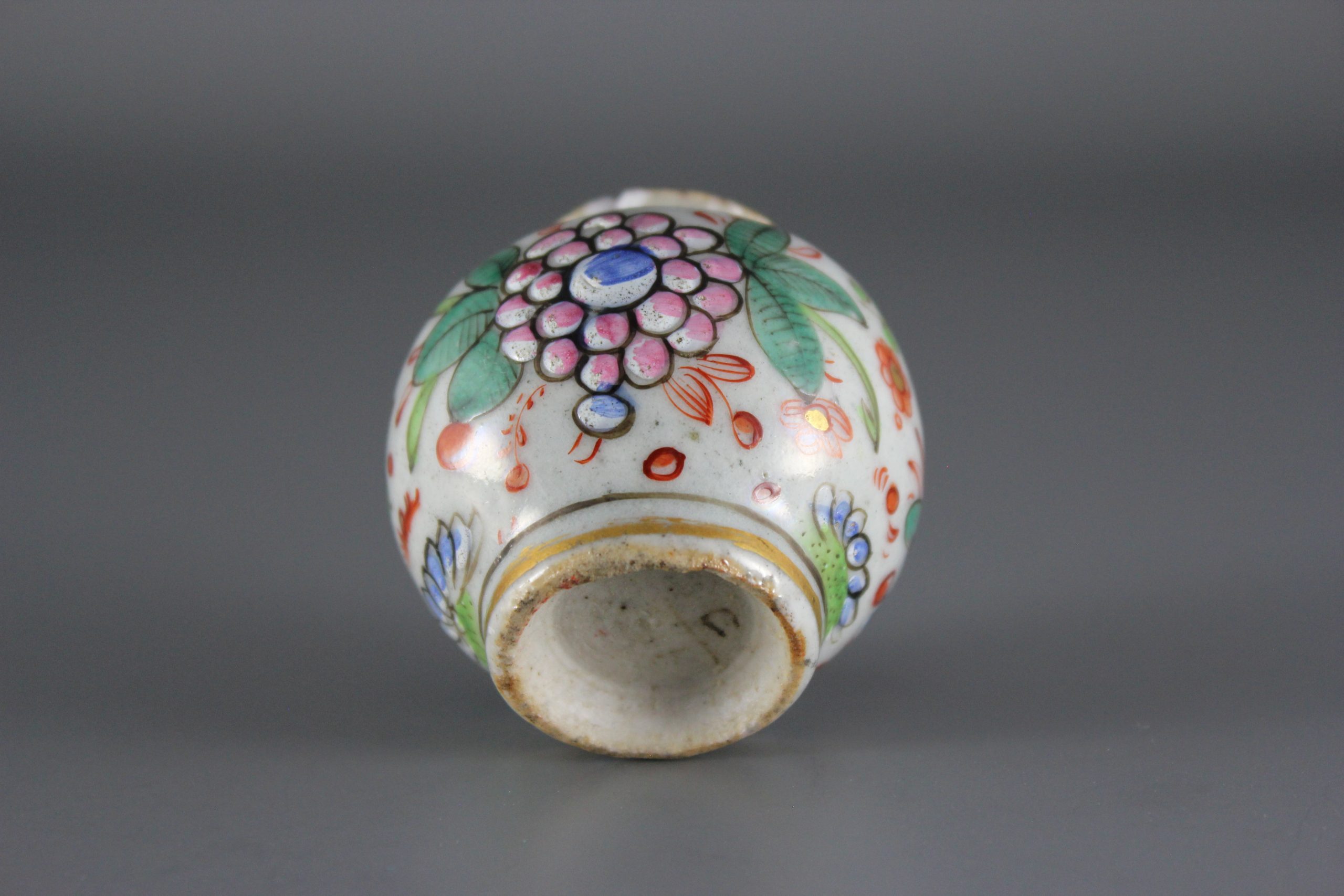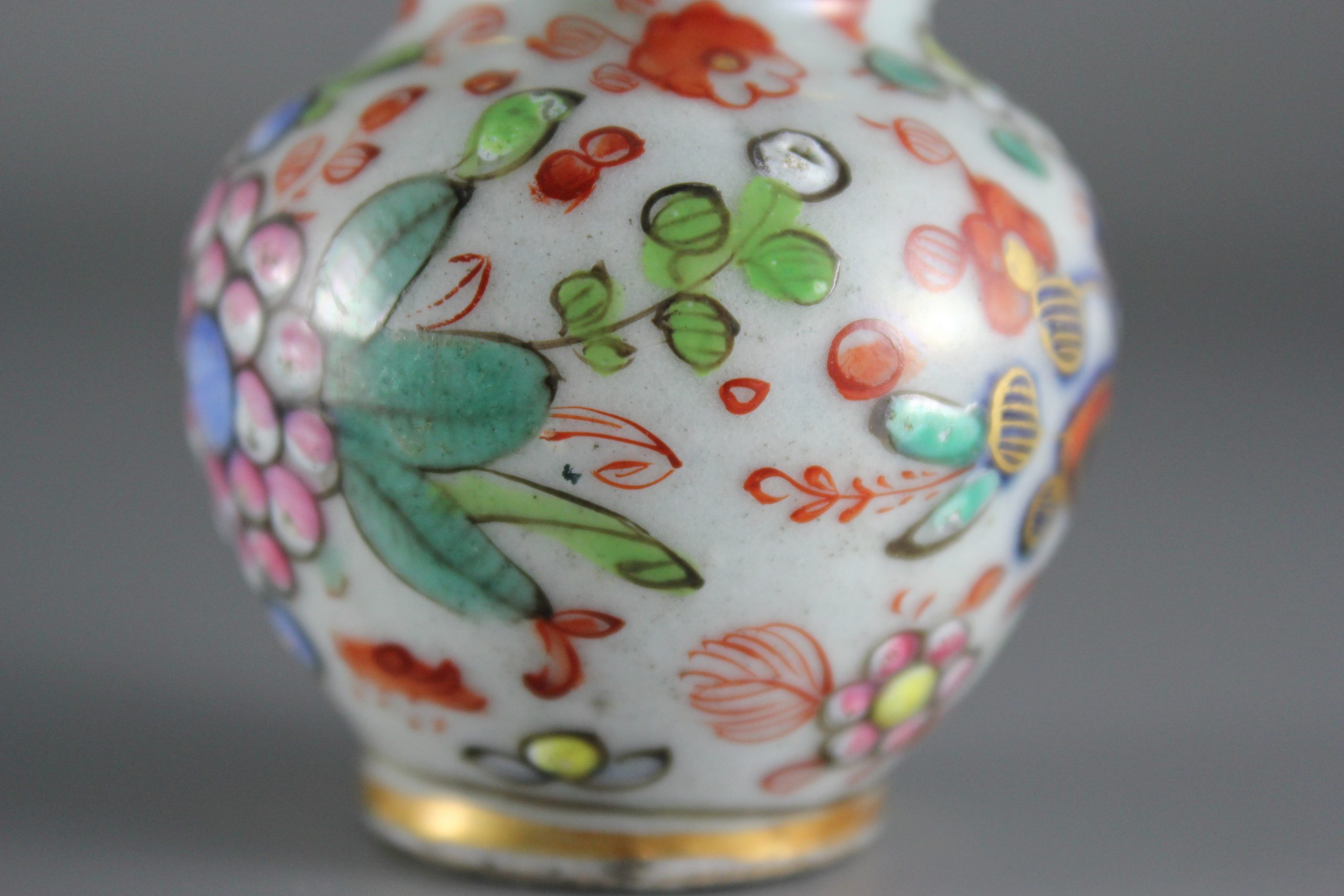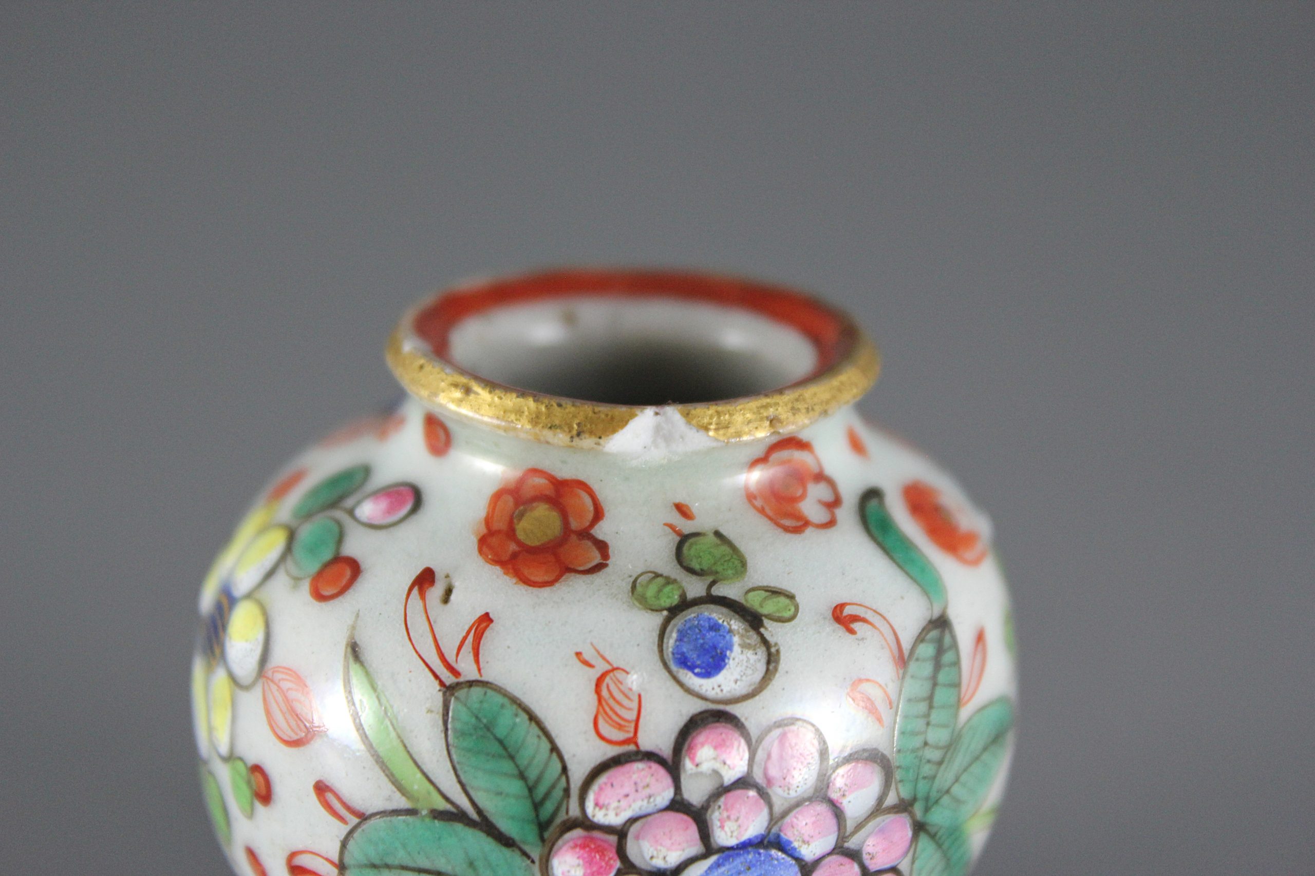 This near pair of miniature porcelain jars (jarlets) or vases likely date from the Kangxi period (1661-1722). The finish to the bases and the cut top rims suggests they were made in Fujian province, rather than Jingdezhen. The underglaze blue decoration is composed of simple flower heads and trailing foliage. Some time between 1800 and 1820, the jars were overdecorated (clobbered), probably in London, with richly coloured enamels and gilding. The original Chinese underglaze decoration remains, although it has been greatly enhanced with the addition of colourful flowers and foliage. English decoration on this particular vessel form is especially rare.