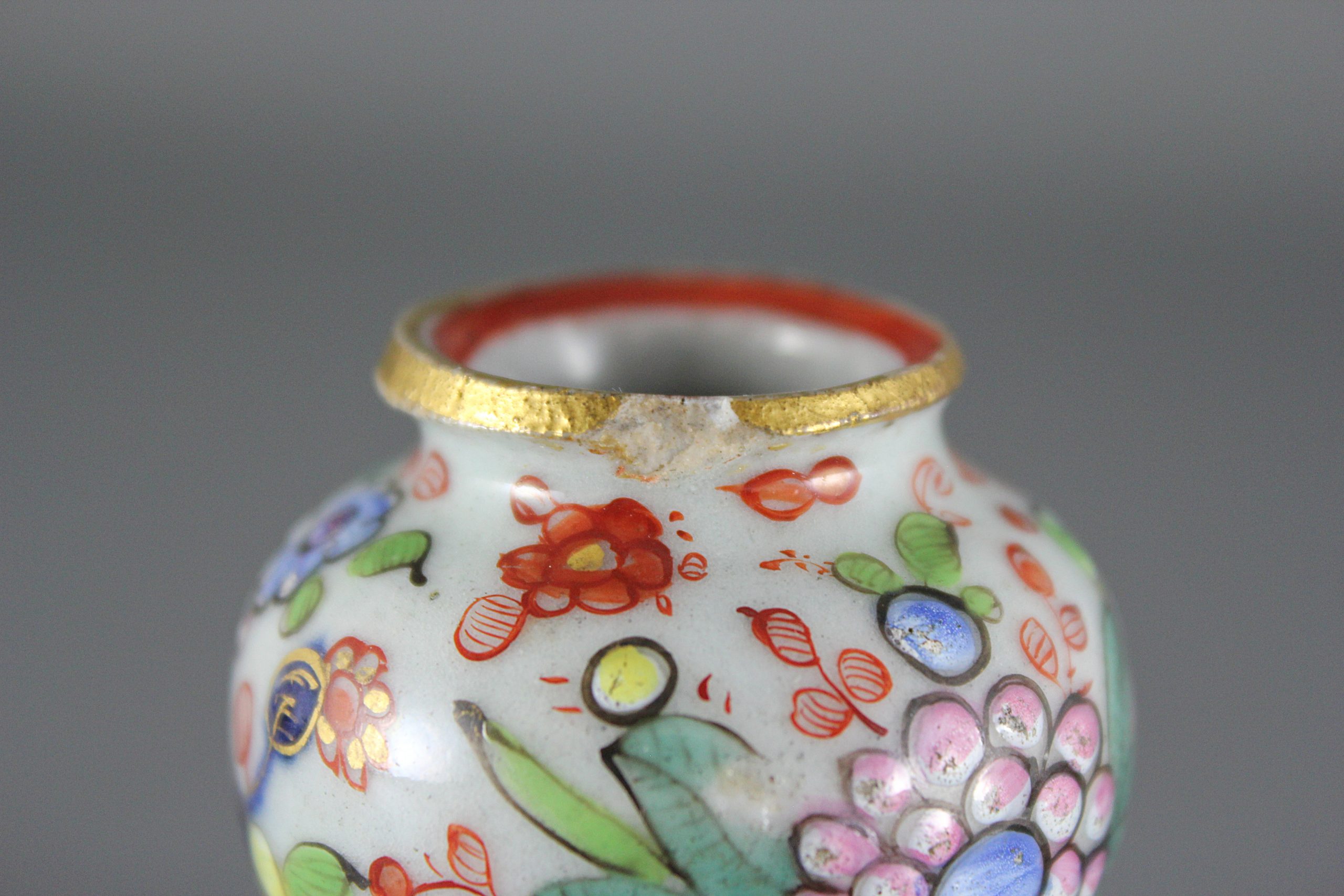 Condition: The enamel and gilt decoration is in excellent order, with very little wear. Both vases exhibit typical minor potting and firing anomalies associated with the period. Vase 1: There is a chip to the rim, and a small glaze flaw to the orange line within the rim. This flaw almost certainly occurred before the enamel decoration was added. There is a small, shallow chip to the underside of the base, and a small graze to one of the green enamel leaves. No cracks or restoration. Vase 2: There is chip to the rim of this slightly larger vase, and a tiny glaze flake to the rim. No cracks or restoration.